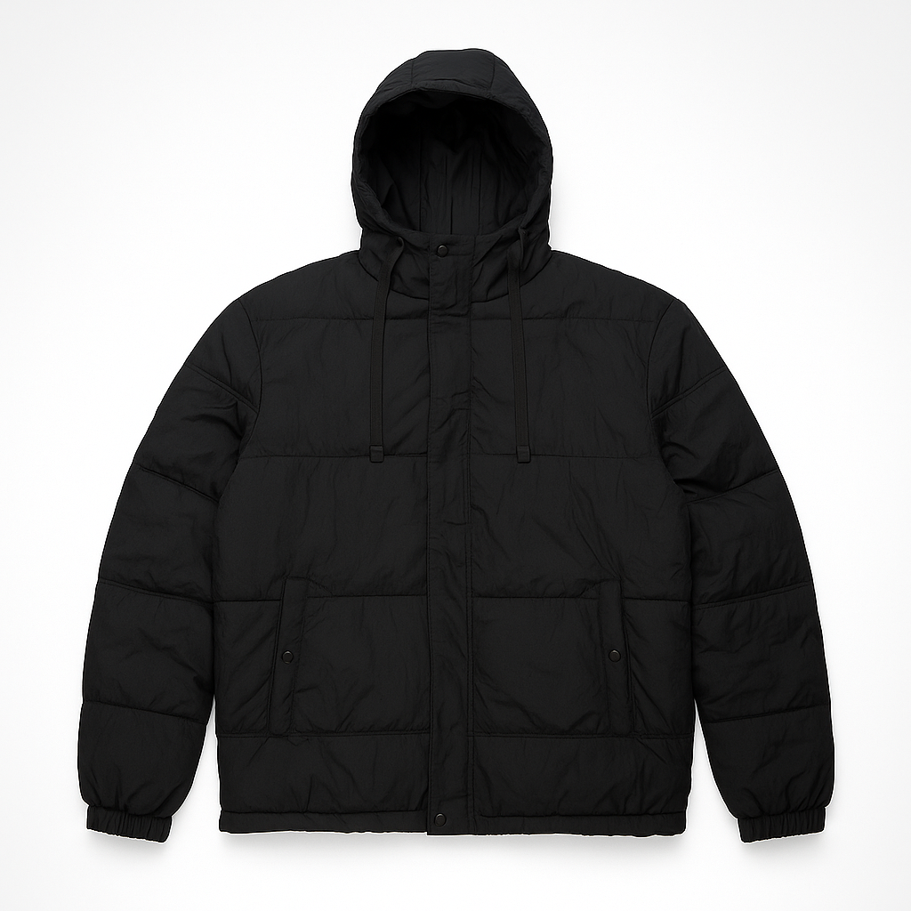 Shop Black Hooded Winter Jacket for Men. Stylish, warm, and lightweight with hood & zipper. Perfect for winter wear, outdoor, and daily use.